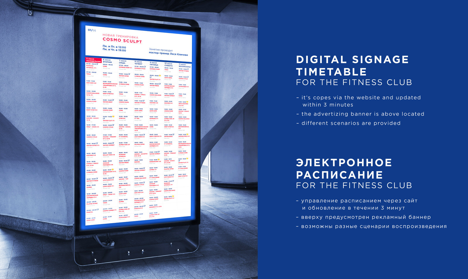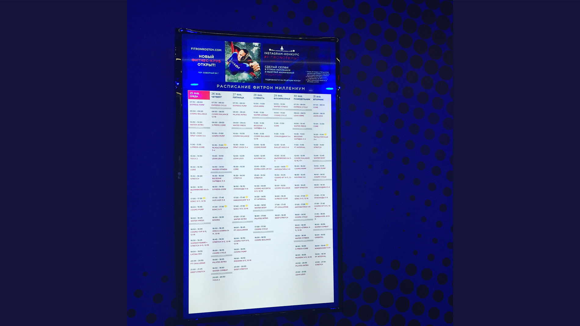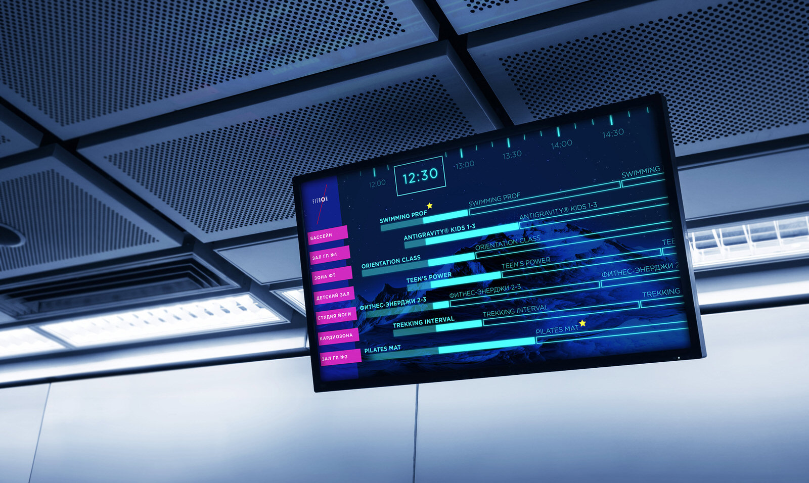 Вверху расписания предусмотрены зоны для рекламных баннеров и текстовой информации. Это было самым простым решением в данном случае, функционал и сценарии разрабатываются индивидуально под специфику и возможности организации. Динамическое расписание показывает какие тренировки идут в текущий момент времени и в каких помещениях.