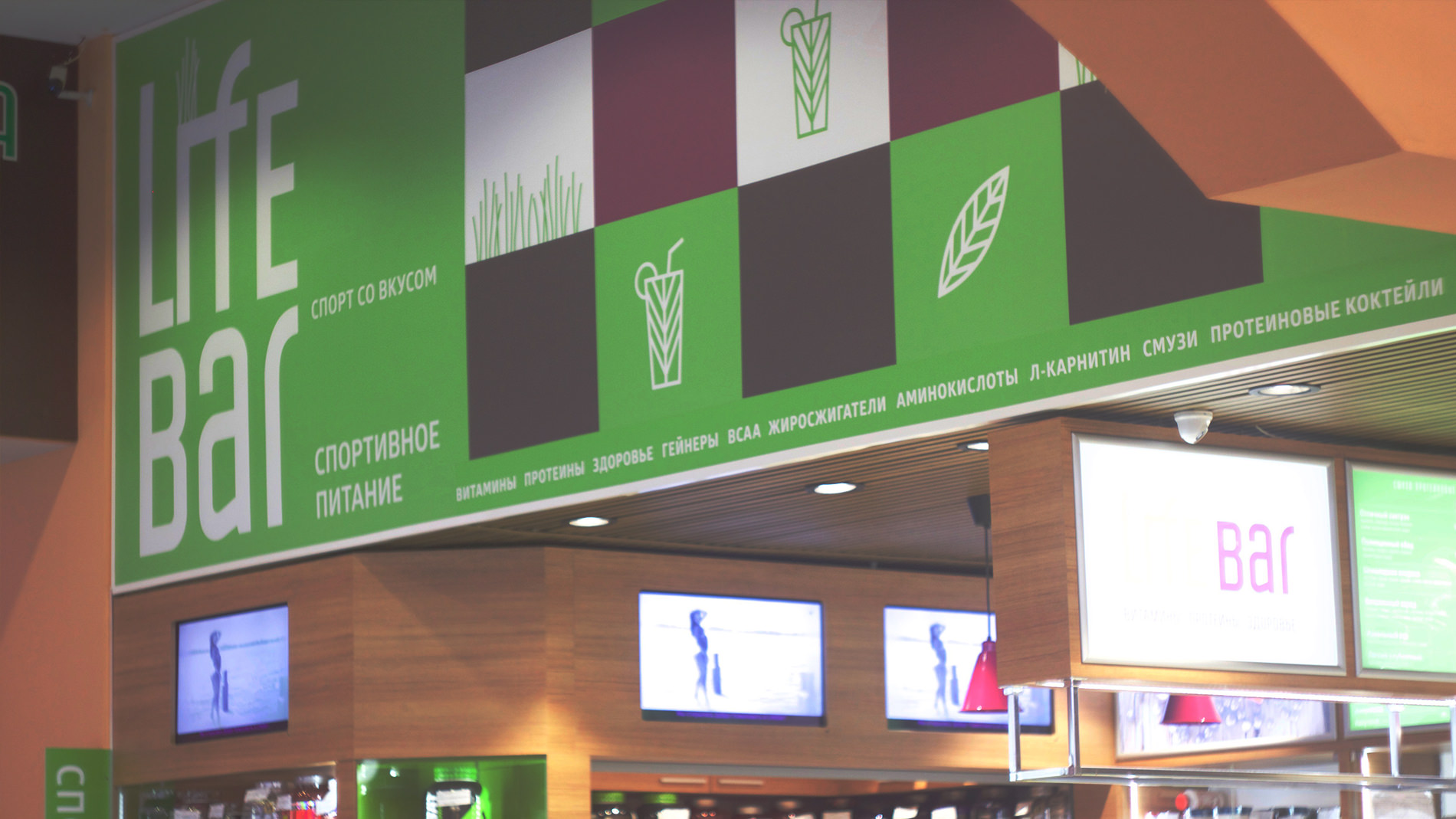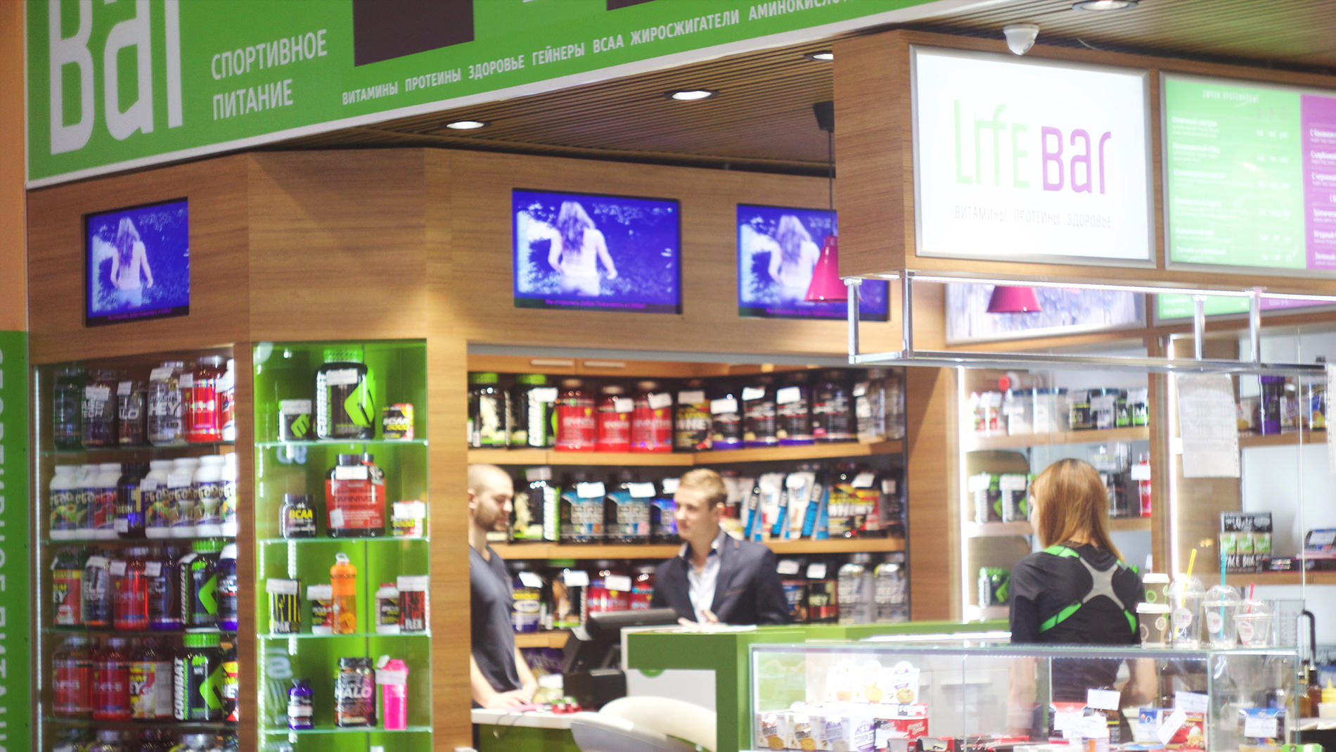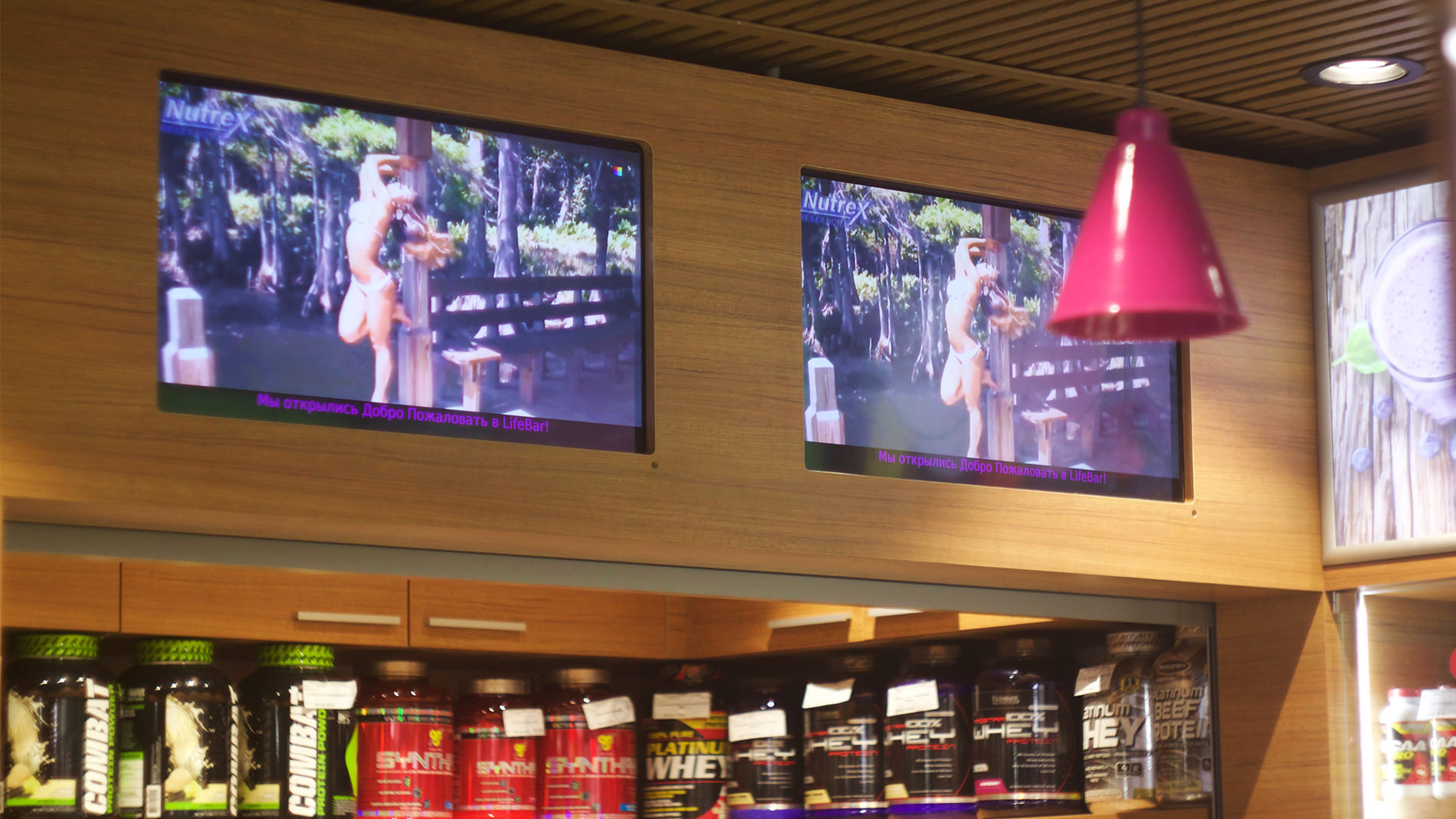 Цифровая вывеска для Life Bar спортивное питание В данном случае представлена небольшая торговая точка сети, расположенная в ТЦ "Горизонт". Мы реализовали управление контентом на 3 экранах. Поддержкой организация занимается сама. Узнать стоимость